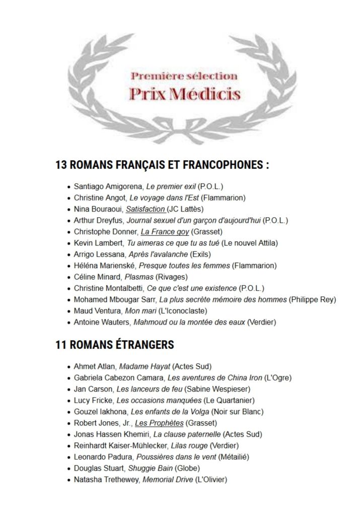 Bonjour la compagnie littéraire. Hier, la première sélection pour le Prix Médicis a été communiquée. Voyons cela de plus près…