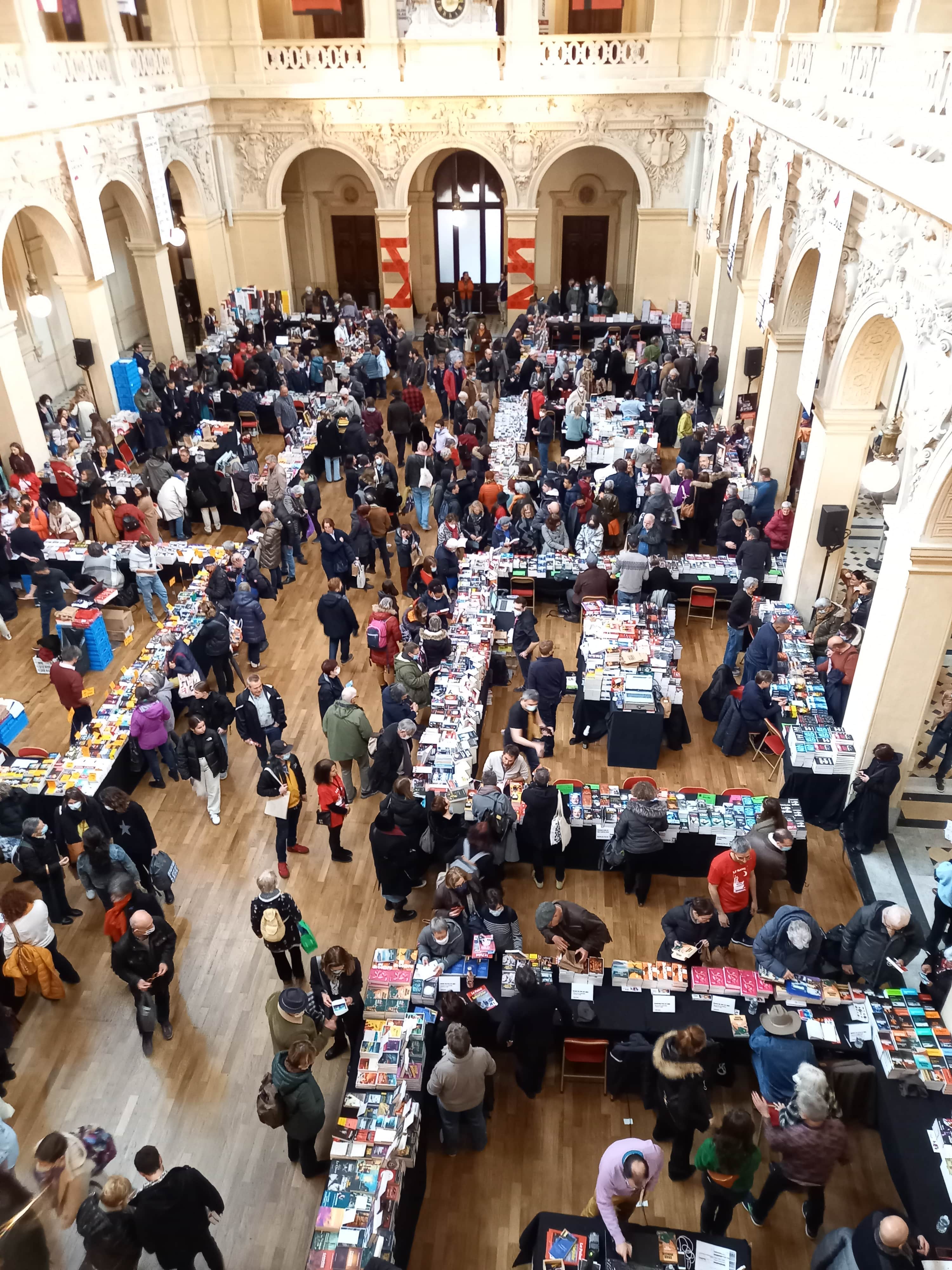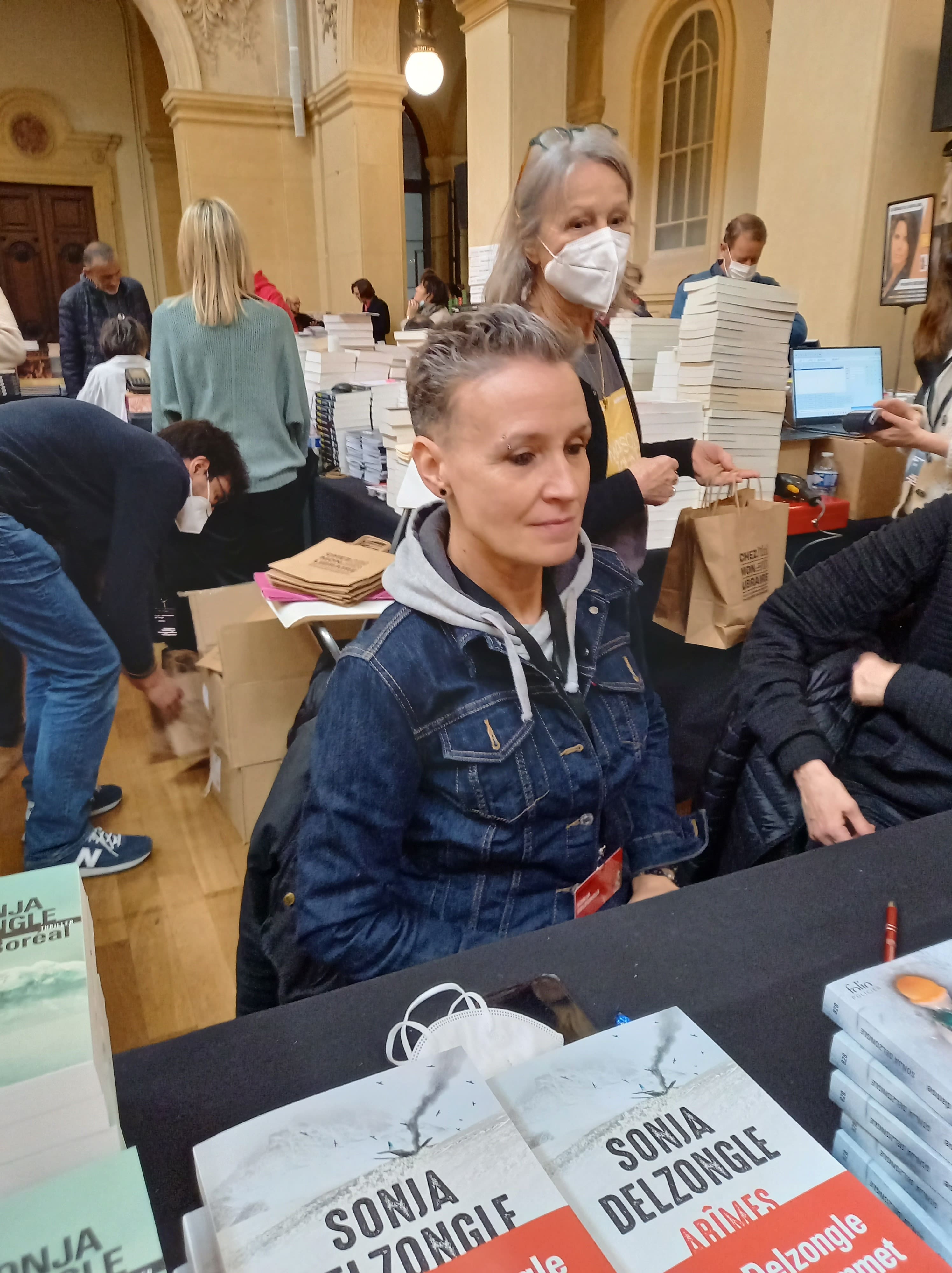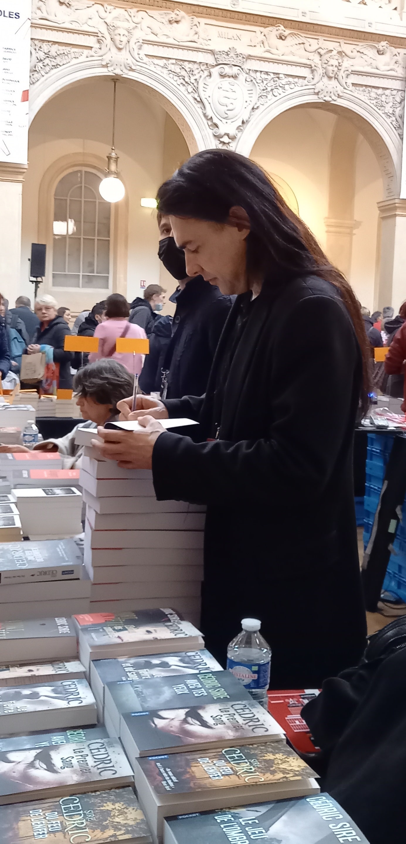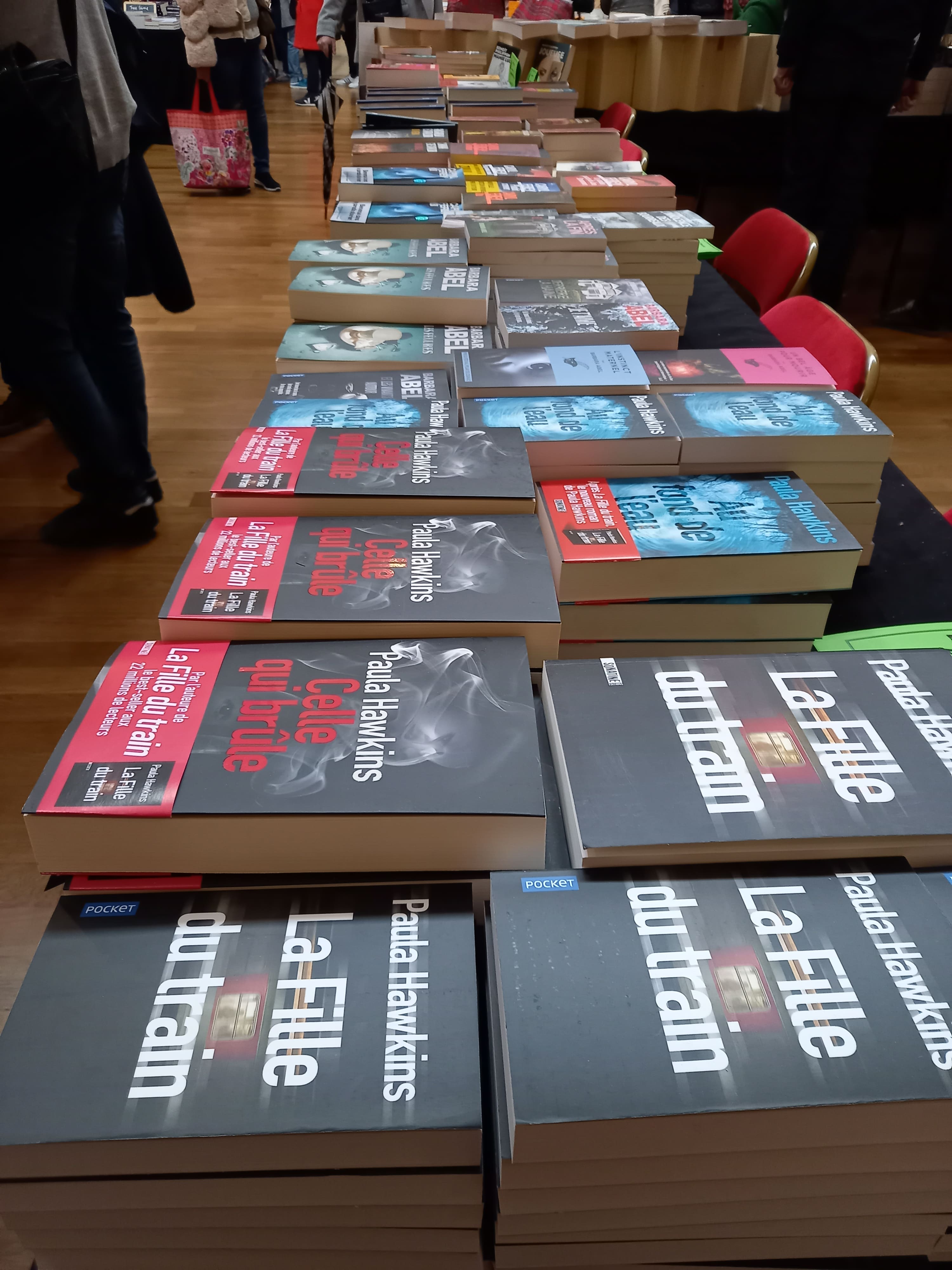 J’aime prendre des photos d’en haut, cela permet de jauger le monde, et de deviner où se trouvent les auteurs !! Le monde arrive, il faut jouer des coudes, les files d’attente s’allongent, certains auteurs sont totalement inaccessible, je pense notamment à Olivier Norek et Bernard Minier. Je suis repartie dans la fosse aux lions !