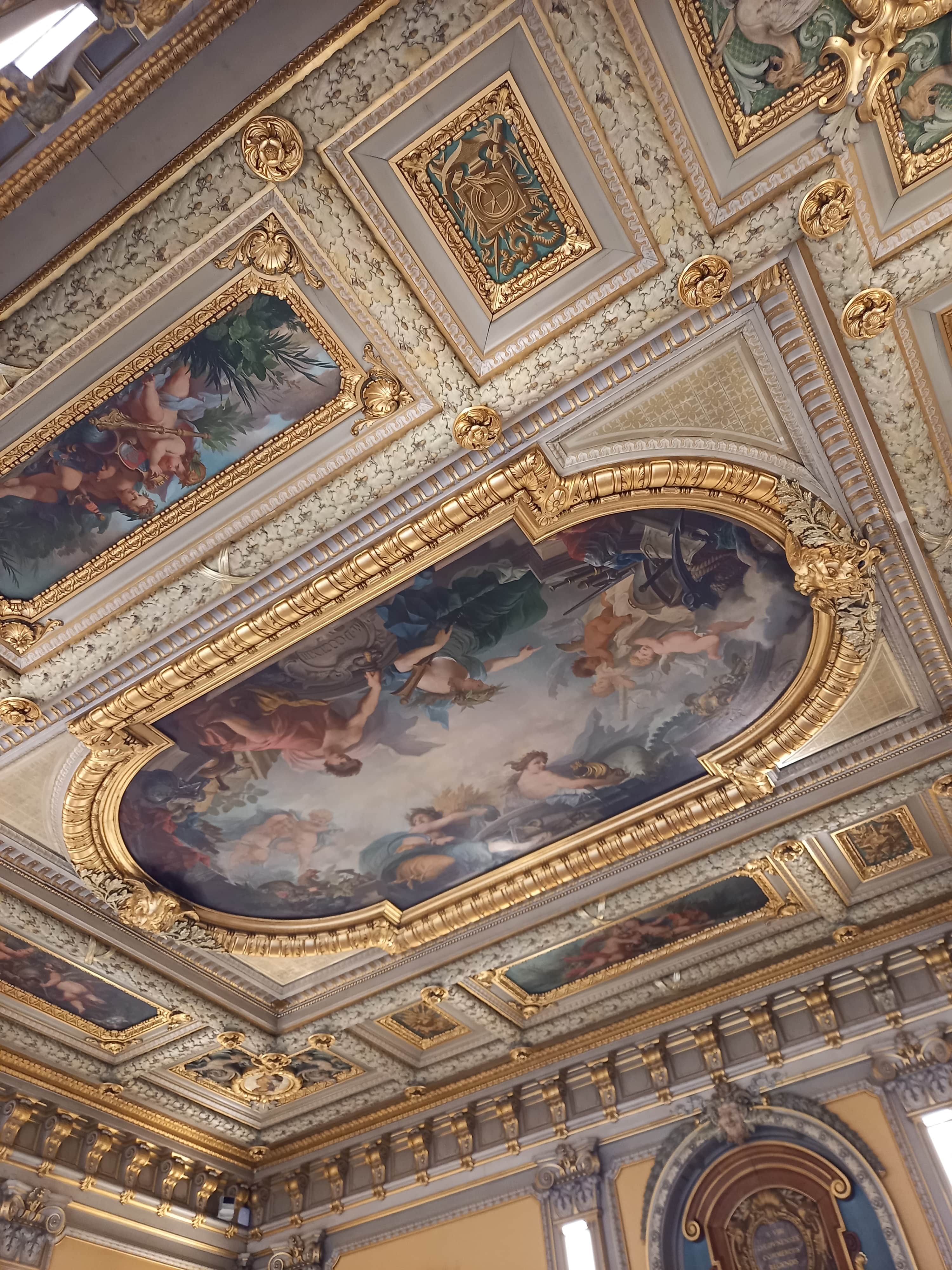 Le plafond est composé de 13 caissons de tailles différentes et séparés par une guirlande de laurier ponctuée de rosaces. Aux angles, il s’agit de décor de stuc.