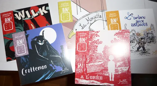 Voilà une histoire tout à fait surprenante….Ma fille, en 3ème, me dit qu’en français, ils ont étudié des BD au format bizarre, elle avait trouvé ça rigolo. Elle m’envoie une photo, hop, je demande à mon libraire préféré (Raphaël, de chez Forum, pour ne pas le nommer !). J’adore parce qu’il connait absolument tout !!! Il me parle donc de cette collection BN² édité par Jarjille.