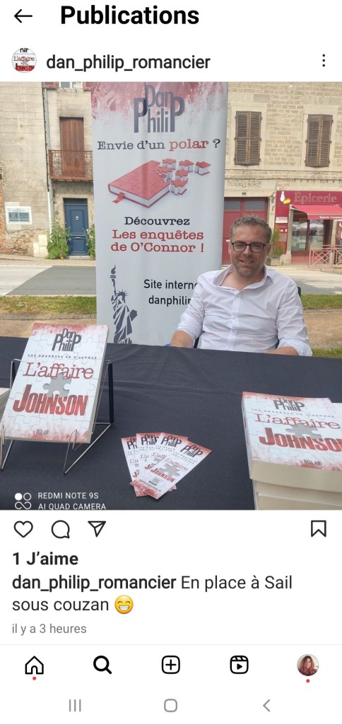 Hein ? Quoi ? L’arrière-plan me tape à l’œil, je me dis « Tiens on dirait l’épicerie de Sail ». Mes neurones se connectent, et me disent « Mais C’EST l’épicerie de Sail ». Je lis le commentaire : « En place à Sail sous Couzan » ?? Bon, OK, Watson et ses déductions infaillibles a encore frappé. Dan Philip est en dédicace, en ce moment même à Sail, à quelques centaines de mètres de chez moi, et je n’étais même pas au courant. Affligeant, franchement…