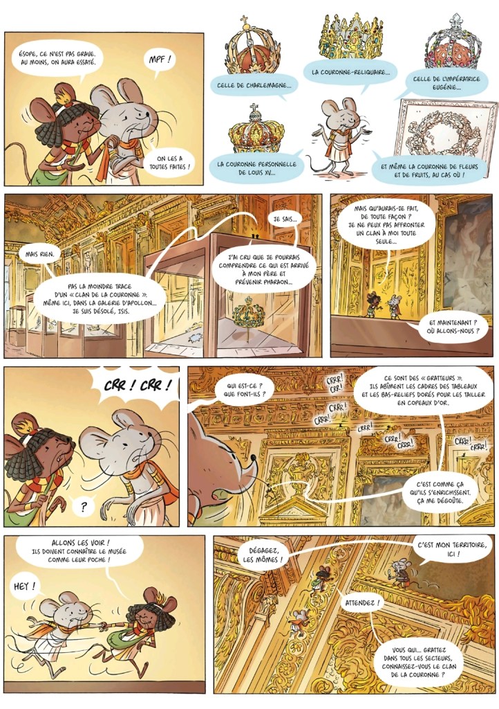 Pendant ce temps, chez les souris…Esope et Isis sont à la recherche du Clan de la Couronne, ce qui les mène à la superbe Galerie d’Apollon où sont exposés les bijoux de la Couronne et le célèbre Régent.