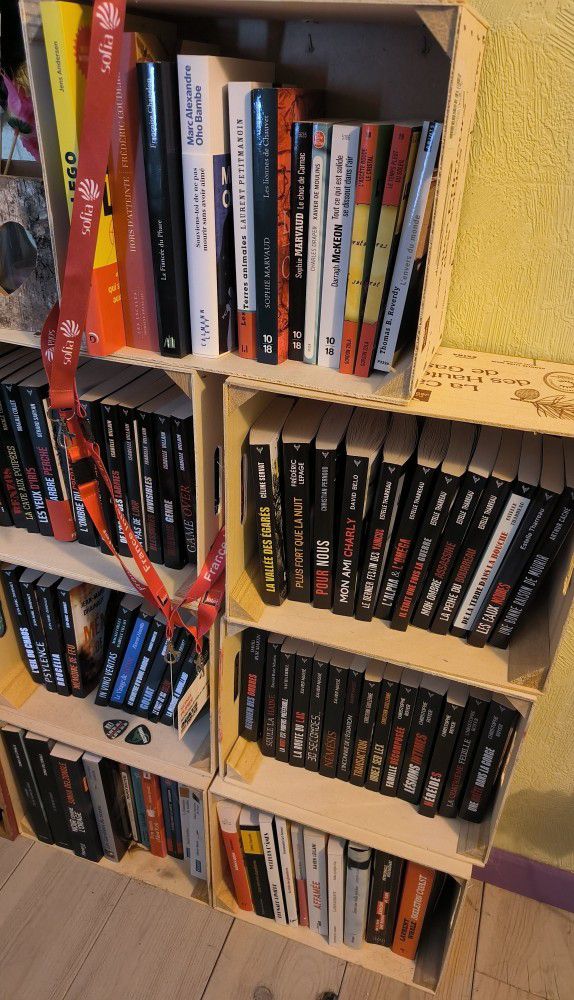 J’en ai fait de la manutention de livres ! Mais j’ai trouvé le classement qui me convenait le mieux, à savoir par maison d’édition, puis par ordre alphabétique d’auteur. Et j’ai décidé d’apposer une gommette sur les livres dédicacés.