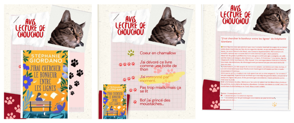 👉 TikTok –sonia.boulimique.livres : sous l’œil critique (et un brin snob) de mon chat. Attention, ce compte est fortement déconseillé à ceux qui n’aiment pas les chats. Les autres y trouveront des avis félins affûtés et des coussinets bien sentis !